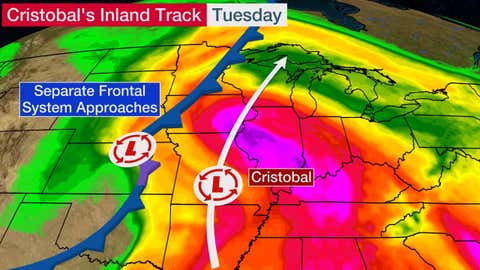 Cristobal's Inland Track to Bring Heavy Rain, Gusty Winds and Isolated Tornadoes to the Midwest on Tuesday